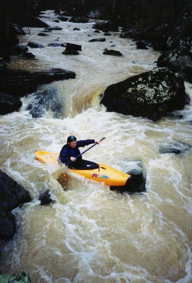 A tributary to the Calvert Prong, this creek is ultra-tight and needs recent rain. The first mile is flat. After you pay your dues by ducking under, paddling over, and walking around logs as you pass by the Oneonta sewage treatment plant (joy), you will be rewarded. Once the gorge is reached, the action is immediate. The best rapids are at the top. Perhaps 3 to 5 class IVs are separated by short pools or eddies. Scouting may be advisable to avoid missing eddies. After the bigger ones, the action subsides to tight class III. I think the first major rapid will be dubbed Hepatitis A, B, and C. The second is Les Amis (some of you may get this...). The next rapid is split by a long island and is not steep, but is fun. A bit further the creek goes over a small drop with a vertical rock wall on the right. The second half of this rapid is a fast sweeping right turn with a boof at the end.