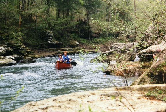 The put-in is at the Sipsey Recreation Area on County Road 60. The recreation area has a large paved parking lot, picnic tables, restrooms and a sloping ramp, making it one of the most convenient river launching sites in the state. The river downstream of the launch site is a combination of vertical canyon walls and steep hillsides. The flow of the steam is continuous and the water color ranges from clear to deep turquoise in the pools. Shoal areas appear frequently and add to the excitement for beginner canoeists. Only one actual rapid occurs at a spot where the river necks down to the right. There is actually very little drop across the rapid, but standing waves form at the bottom and give a bouncy ride. At high water levels the standing waves will increase in size. There is a boulder in the center of the rapid which has wrapped several canoes. [Some call this rapid 100 yard dash].