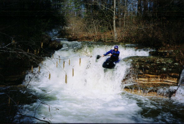 It is red and green. On the outskirts of Cullman, I don't know that I can recommend this creek except for a juicy chunk of class V known as Friendship Falls at the put-in. A split personality creek it truly is. The George Lake spillway (aka Friendship Falls) drops about 45 to 50' right out of the gate. It is a multi-part slide / waterfall rapid. It is quite runnable, though we only ran the last two drops. The 2nd or 3rd part pushes over to the right and impacts an old wall. This would be a bad place to flip since you would lose skin and possibly body parts on the ensuing drops. But it is certainly within the realm of the class V boater. You could actually easily bag this little baby and then take out on the bridge just downstream for a self contained class V infusion just off interstate 65.