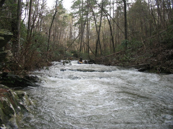Usually I describe the run before the access but in this case the situation is reversed. There is no practical way to judge the level before committing to the run. This is because the take-out is across a lake and the put-in is 45 minutes, or slightly less, down a trail. The trail the old Oxford/Cheaha road that is on the topo maps. Park the take-out vehicle somewhere along Lake Hillabee on CR24. Access to this lake may be by permit only, I'm not sure. To find the put-in, go back up CR24, turn south on Rt 281. After you pass under the power lines, then an overlook, watch for a gravel pull off on the right side. This is the start of the trail, which heads down to the creek. It is in excellent shape. It is an old CCC road project from the depression, complete with fine stonework supporting the road and a good stone bridge at the creek. Towards the end of the trail, you will see an obvious Y in the trail. Either one will work, though we went right to the lower access to maximize water.