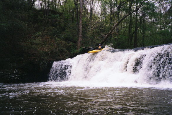 The first run was so low it is too painful to describe. The second was OK. Jim and I ran the 15’ waterfall at the put-in. Jim actually had a nice line while mine was upright yet Branhamian in angle. Immediately thereafter, a long slide delivers you into a pool. The run drops about 140’ over 1.5 miles, and is tight but never over class III. Several logs have to be dealt with and really need to feel the chainsaw this summer. One pretty neat 360 hole is found just upstream of a rather large undercut rock. At 5’ on the Locust, the section down to the 231 bridge has 4-5 sweet front surfing waves. If you happen to be in the Locust area at high water and like to get tight, check it out. It is pretty easy class II/III stuff if you walk the first two rapids, which is not hard to do. One caution, though, this creek features more chicken content than most Campbells products.