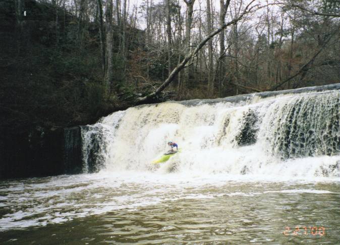 A fantastic alternate high water put-in for the Locust Fork. It opens up with a slide, a 15' waterfall, a pool, then a long, fast, easy slide. The rest of the way is a class II/III narrow creek. The surfing on the Locust at 5-7' (Locust gage) or higher is worth it alone. Be not intimidated by the waterfall and slide, you can always put in below them. As of 11/2001, this creek was rendered almost logless by Huntsville Canoe Club members.