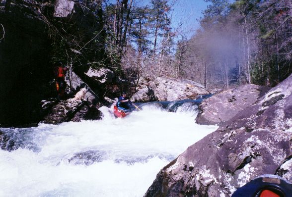 Most folks put-in at Lake Howard, but you can add three more miles by putting in near Cloudmont. I've never run this upper part and there appears to be minimal gradient. The optional rapid at the Lake Howard Dam is a multi-drop IV that is easily scouted or walked on river right. Just after that, two tight and fun rapids will make sure you are fully awake. Good class III stuff continues on and off until you get to Broken Nose. It will be semi-obvious, stay right to scout or run - the left drop will take you into the undercut (see pictures). Overall, comparable to the middle Tellico or a bit easier. As of 2/04, there are very few logs, and the few there are can be easily avoided at 250 cfs. At 250 cfs, it took us 15 minutes to paddle the flatwater at the bottom of the west fork, 20 minutes to get to Road 03, and an hour more to get to the 35 bridge. There are some sweet waves in the last two miles above the 35 bridge.
