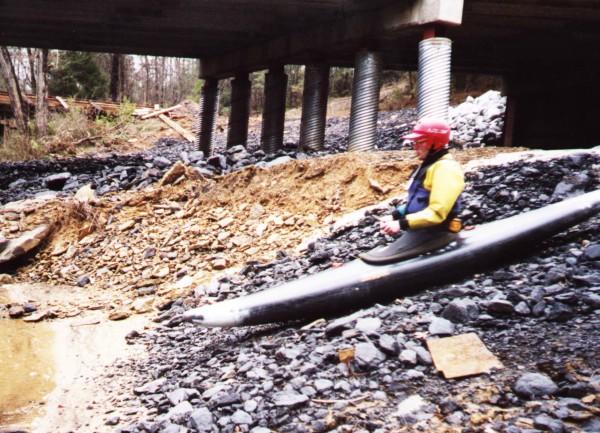 Our small group, Mark D', Dale Culpepper, Dave Curry, Kay and I, ran a rapid shuttle because we already knew that we had to put in over twelve miles of paddling on a cloudy winter day to finish before dark. The shuttle directions that Mark had obtained from a Tuscaloosa acquaintance proved to be extremely accurate and we were on the water shortly before 11 a.m. Mark seemed extremely pleased to have a "coal slide" seal entry point at the put-in.