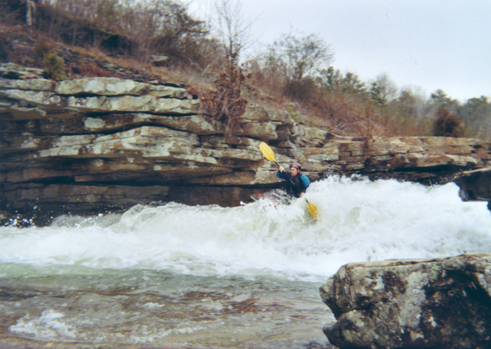 We put onto Whippoorwill creek and had an idyllic, enjoyable paddle to the confluence. From that point on, the creek began to drop rapidly, and the velocity and push of the water increased dramatically. We scouted and paddled the first few rapids without event. Then, at the top of a rather long rapid, I lost a wrestling match with a bush in an eddy (there were no kayaks available) and ended up swimming without my boat. I had no choice but to hike, paddle in hand, hoping my boat was smart enough to swim safely to shore. It was. About two hundred yards down stream it had neatly broached itself on some rocks on the opposite bank. Mark and I tandem-ferried across the creek and everything was back to normal. Sure.